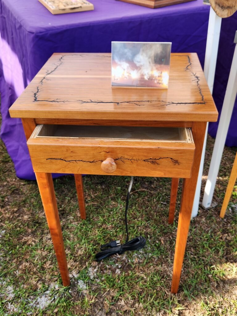 The Wooden Pearl Handcrafted, Eye Catching, Conversation Starters and Heirloom Quality Creations, For Everyone!845-453-9363 Fractaled Side Table 2,000 Volts of electricity inlayed into the wood. Includes a charging station in the back. Contact Us Custom Designs Available and Welcomed.Shipping available on most pieces.The Wooden Pearl845-453-9363SOUTHERNPEARL2023@GMAIL.COM